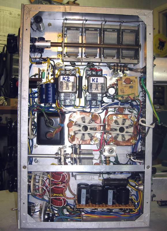 the tube plates. Neutralization is done by adjusting this trimmer. Note the copper sheet on the tube sockets. The idea is to provide a good common ground for the various bypasss capacitors. A little 'tongue' of copper passes through the socket hole and is bolted to the top of the chassis, to provide the shortest possible return path from the plate circuit to the filament and screem bypass capacitors. Does it help stabilize the amplifier? Who knows? The transformer to the left of the sockets is for the screen and bias supplies; just above it are the power and soft-start relays. T/R switching circuitry is to the right of the relays. |
