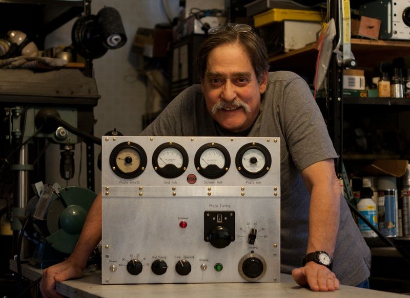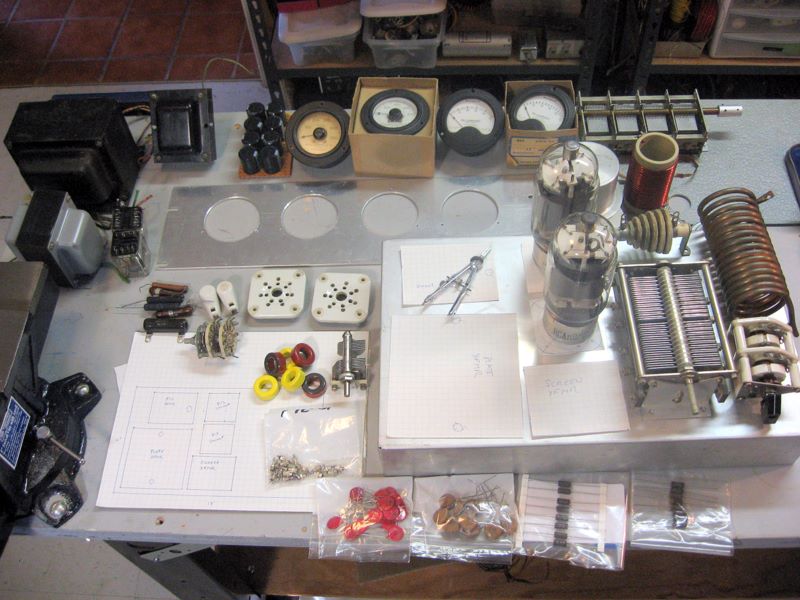 | I had intended to document the construction as I went along, but I didn't do a good job of it. Here are some of the parts I started with -- you can see that I made some changes, like the vacuum capacitor instead of the bread slicer shown. | ![]() |