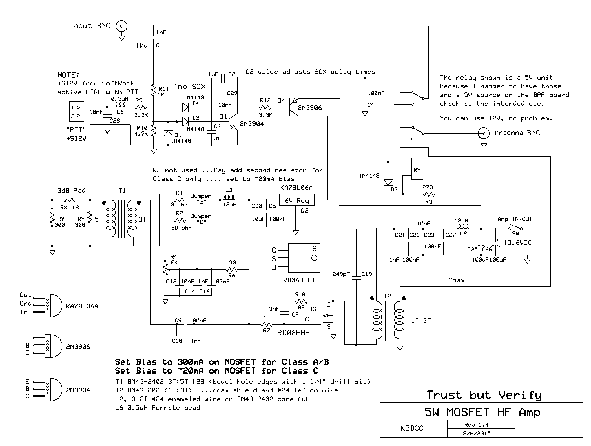 My idea was to provide a good and low cost Amplifier for the HF bands (160m to 6m) which can be driven by a SoftRock SDR or any other low power driver and provide ~20dBm of gain. Low power being defined as ~100mW. Some of the new SDR units supply less than 50mw and really need a little �boost�. This Amp uses the RD06HHF1 RF MOSFET which are rated at 6W output for 12.5VDC at 30+MHz. These parts are quite robust and much better than the IRF510 Switching Power Supply MOSFETs used earlier, largely because of their low cost and availability. The other advantage of the RD06HHF1 is that the mounting tab is attached to the �Drain� pin which is at ground potential �so no mica insulator is required. Just like the 20W HF Amplifier Kit #15, this Amplifier has a Signal Operated Switch (SOX) for CW QSK. I didn�t really put it there for SSB �..but who knows (still better to use PTT). Did I mention good and low cost ?