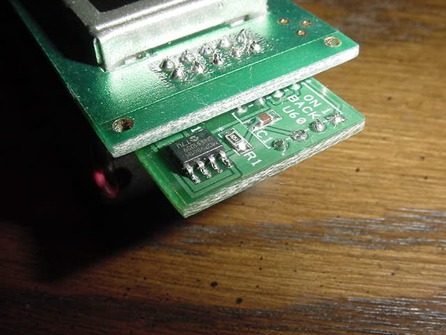 Closeup of the small microcontroller board with the temperature sensor (8 pin SOIC). The microcontroller is on the back of the board.