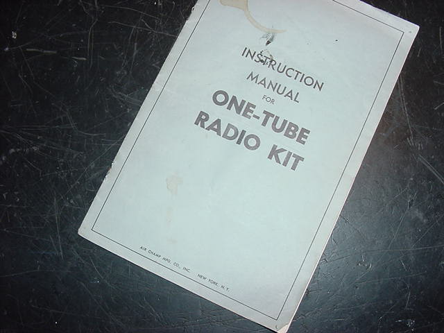 What's this among the piles of paper at an estate ? .....there, in my hands, was an original instruction manual for a "One-Tube Radio Kit", the AC-100 made by Air Champ, the first receiver kit I ever built when I was a mere lad of 11. The manual also contained a carefully cut out board component layout, complete with punch pricks to locate the screw holes on the 7" by 7" plywood base. I'll bet many of you had the same experience with this radio. This was also the radio kit Sears and Roebuck sold in the Cub Scout / Boy Scout department of their store. That's where mine was purchased. Took a long time to find the 22-1/2V battery but it was finally located in the hearing aid section.