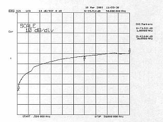 I searched the net in hopes of finding remote coax switch construction details. There wasn't much, I suppose there aren't many hams that have built them. There was a nice page that inspired me to give it a try. Specifically it gave details on how to make DC relays more suitable for switching RF by soldering a strap across two wipers, which shortens the path the signal has to go through. It just so happens I have a box of several dozen identical 4PDT Omron relays which would save me a lot of money over having to buy all new relays for this project (I need a total of 24). To test it out, I modified one relay and soldered coax to it's terminals, then connected it to an HP8753E network analyzer to see how it perform over frequency. Below is a plot of the results:
