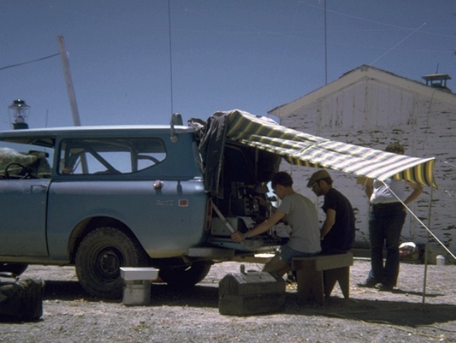 K6NCG - Naval Schools Command Radio Club, Treasure Island, CA -- ARRL Field Day, 1974 -- Top photo -- K6NCG/6 ops WB0HLQ and WB2PFW, wire beams visible above the building. -- View west of the FD site -- Photo's are from Jay WA5WHN's slides!