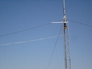 Stainless steel cable on top of two section tower to help lower it with car - 4 cable clamps
