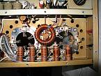 Upper deck of the power supply with the original blower removed. From left to right you can see the Filament transformer, HV filter cap in the rear, Bleeder resistors (back right) and the Relay/Control circuit transformer (front right). |