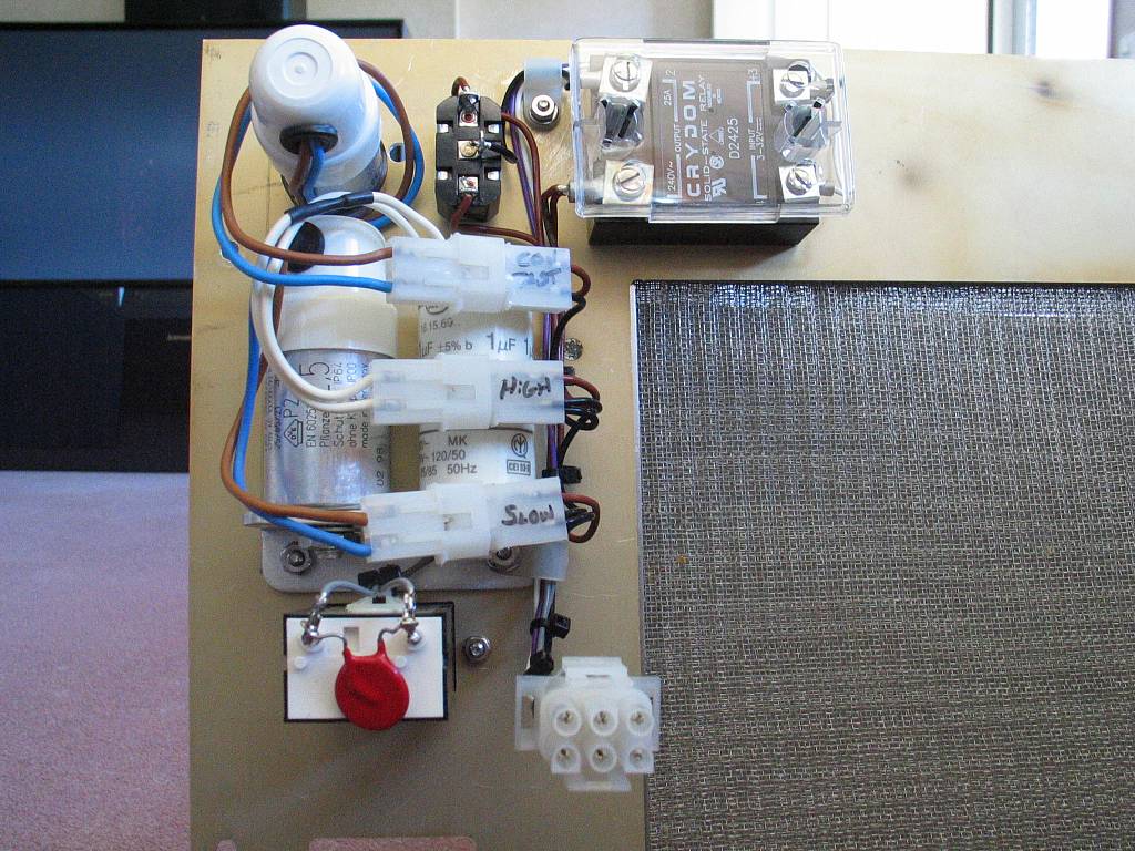 With the exception of the temperature sensor (Thermtrol Snap-Switch) all of the speed control parts are mounted on the inside of the amps back cover. The three capacitors connect to the circuit with 2-pin Molex plugs and sockets. The SPDT toggle switch sets the high speed for either 'High' or 'Contest High'. When the snap-switch closes, the Crydom SS relay is energized which in turn adds the additional capacitance in series with one of the motor leads causing the motor to speed up. |