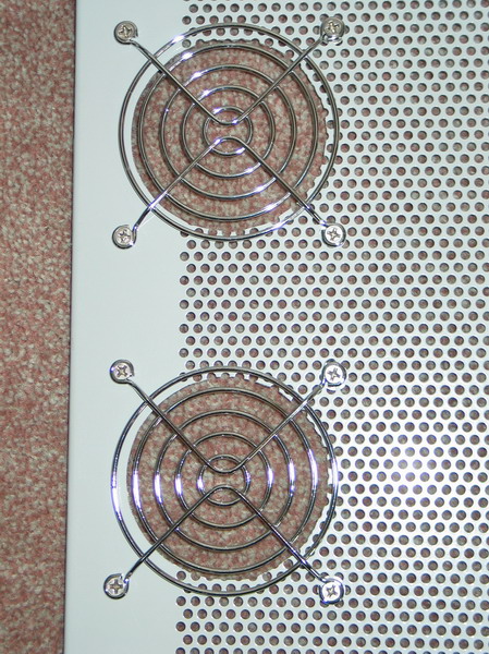 | Another flaw in the original design of the Henry was the top cover of the amp pedestal. Henry uses a perforated aluminum cover which gets very hot because the hot air from the tubes has to be diffused through it rather than being exhausted straight out of the cabinet. When I used the amp for contesting, it was always necessary to remove the outer cover for more efficient cooling. I punched large holes directly above each tube and put the chrome fan guards over each to create a more finished look. | |