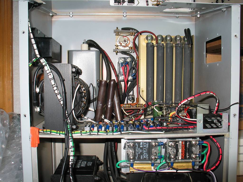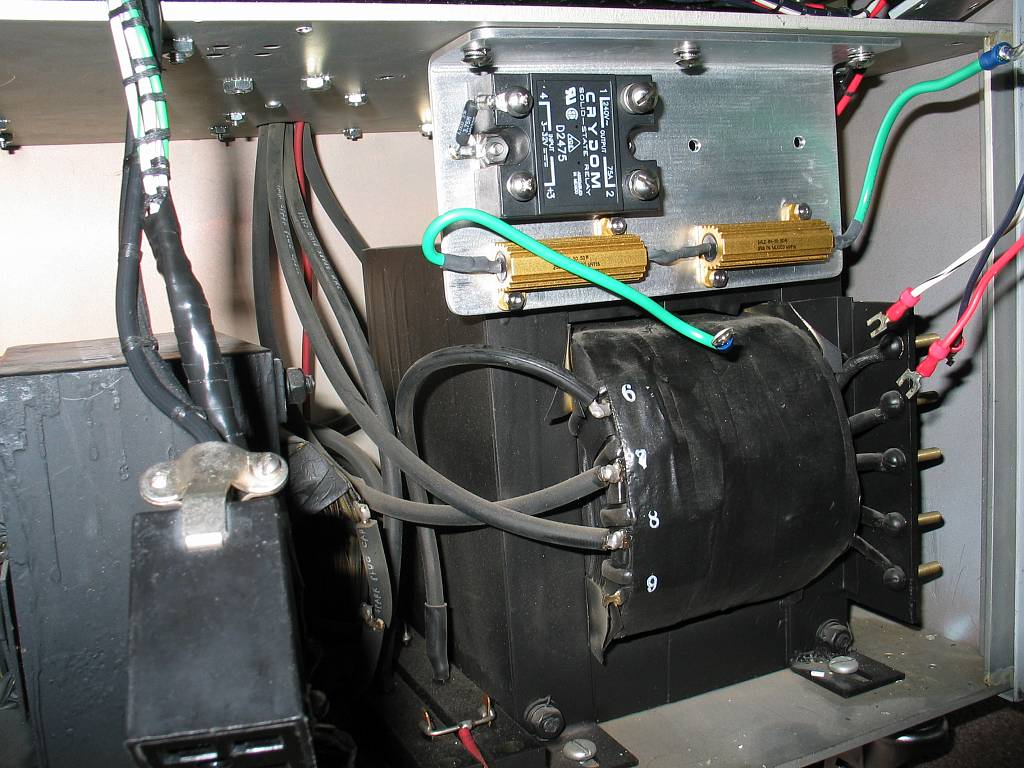 The mounting bracket was made out of 1/8" aluminum by a friend of mine. I drilled and tapped the holes in the larger 3/16" plate material that makes up the lower portion of the power supply chassis. The relays are Crydom D2475s -- 75-amp 240vac with a control voltage requirement between 3 and 32 vdc. I put a 1100 ohm resistor in series with the control lead to each SS relay as a current limiting/voltage dropping device to protect the relay from the higher voltage of the relay supply. The airflow switch mounted on the blower turns on the amps relay control supply (30 vdc) after the blower comes up to speed. I use the time it takes for the airflow switch to close - 5 to 10 seconds on average - as the time delay mechanism instead of a separate time delay relay. This allows the HV capacitor to charge slowly through the 50-watt 25-ohm Dale aluminum clad resistors before the SS relays are energized and then bypass the 25-ohm resistors. 50-watt resistors might sound a bit light until you read the specs. These resistors have a 5-second load rating of 250-watts! |