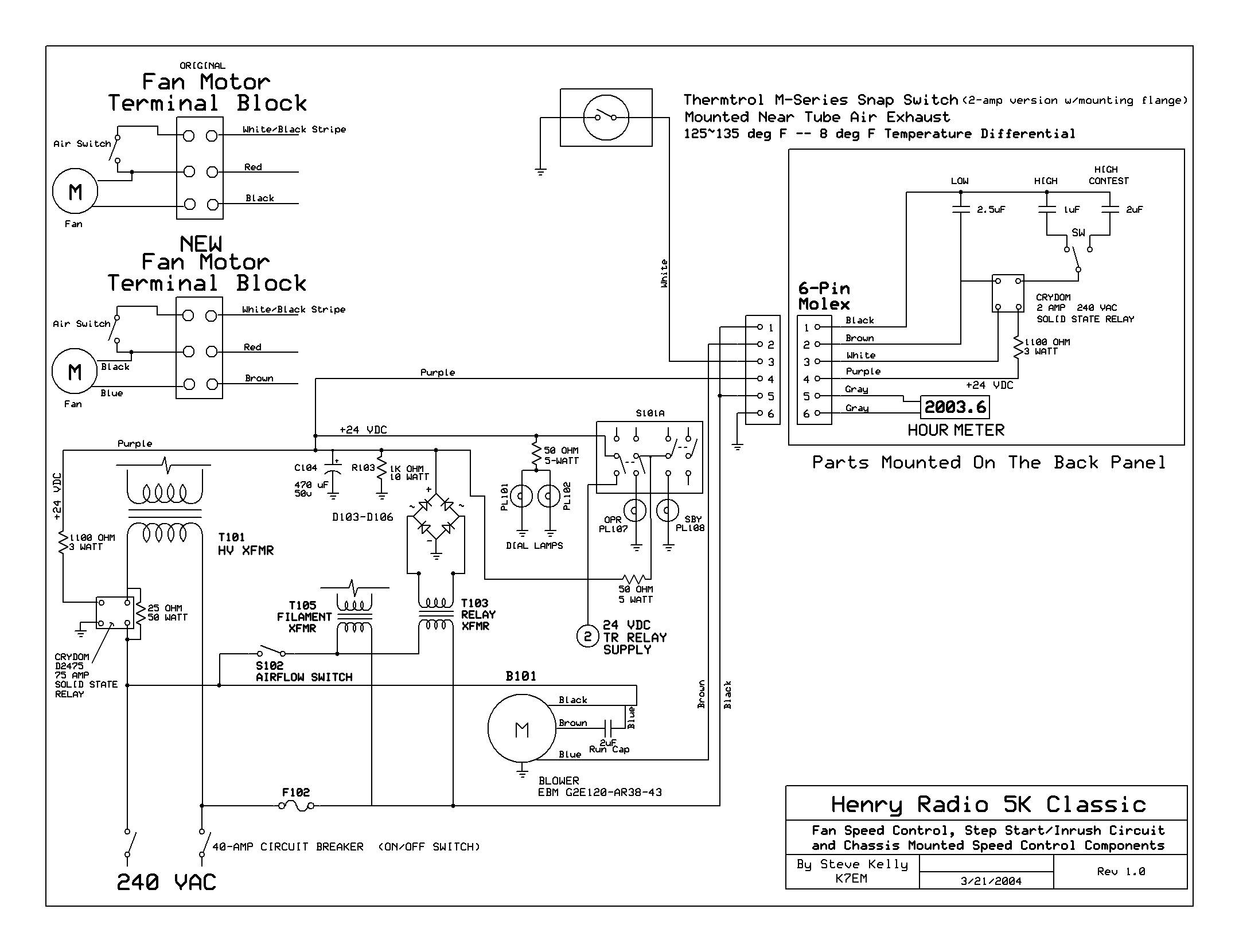 Schematic of the wiring changes I made to the 5K Classic. The lower left corner shows the Crydom SS relays connected to the HV transformer primary leads. The SS relay for this step-start system is powered by the amps existing 30 vdc relay supply. This schematic was drawn with Express PCB and Schematic software -- It's FreeWare. CLICK HERE to download my actual ExpressSCH drawing file. |