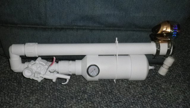 Folding the barrel back over the air cylinder shortened the air gun to 28”. With 25 PSI it will shoot the projectile well over my 60 foot pine trees.