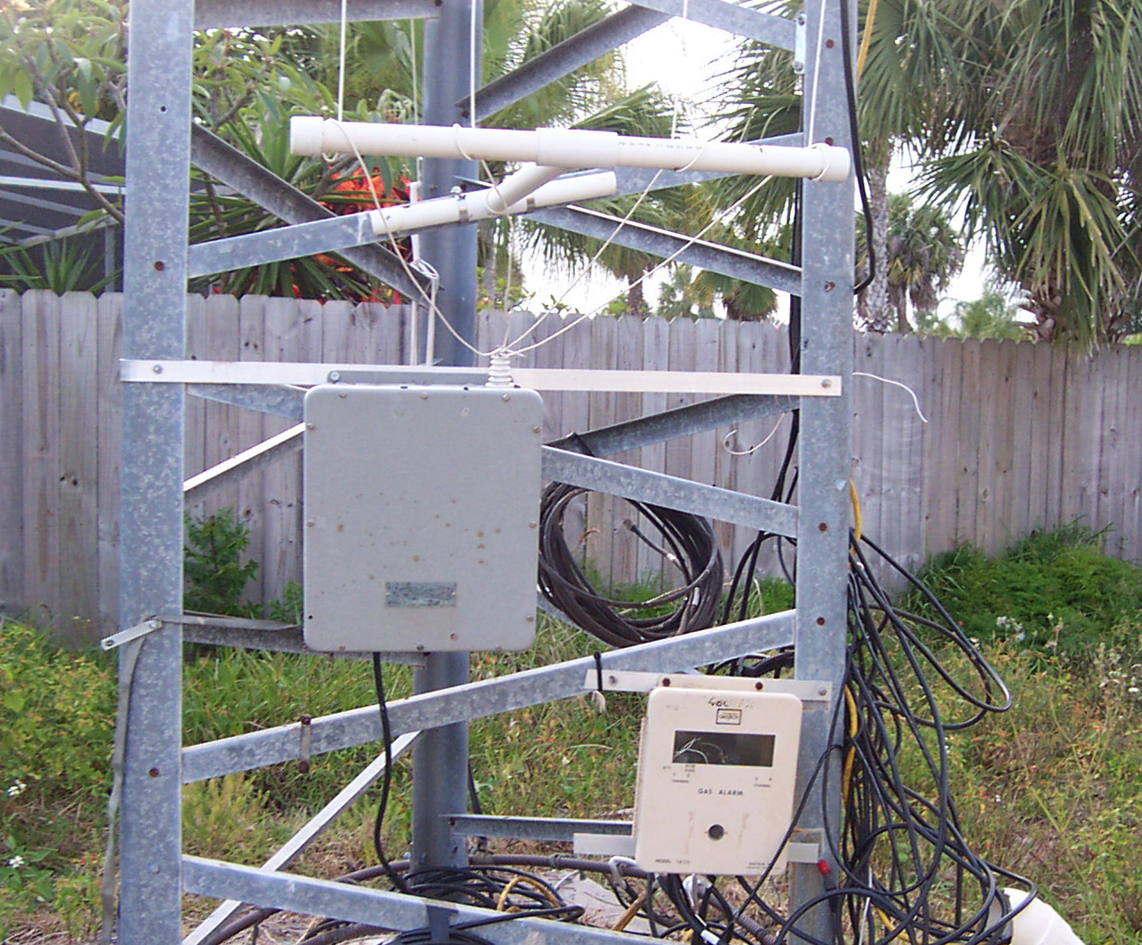 This photo is looking at both towers. The main tower is an self supporting Trylon Titan series, 80 feet tall. The bottom antenna of the stack (at 81') is the interlaced 4 el 15 / 4 el 20 on a 34 foot boom. 5 feet above this antenna is a 5 el Hygain 10M Long-John. At 95 feet is a 2 element hybrid 40M beam. The smaller tower is 45 feet of Rohn 25G, supported by concrete and a house bracket, with a TH6DXX at 45 feet and a WARC D3W at 52 feet. In the near future, a boom will be added directly below the D3W to hold a pair of directors and reflectors for 12 and 17M. Also on this boom will be 5 elements on 6M. Our TV antenna is at 40 feet pointed to Orlando FL. |