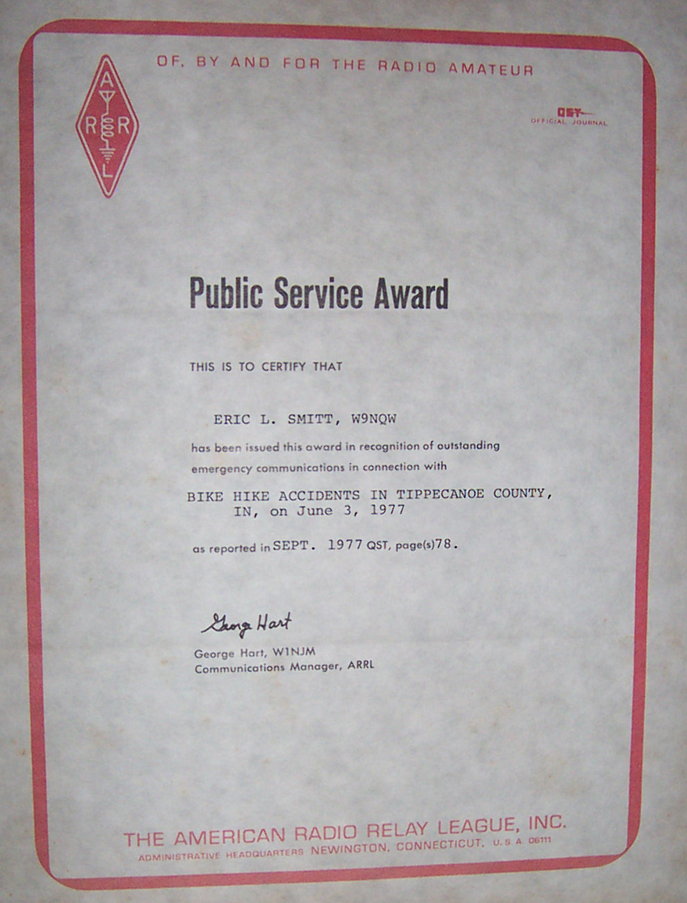 | PUBLIC SERVICE HAS ALWAYS BEEN AN IMPORTANT PART OF AMATEUR RADIO. MY FIRST PUBLIC SERVICE AWARD WAS ISSUED WHILE IN SAN FRANCISCO (1966). I HELPED RESCUE A DRIVER WHO HAD CRASHED AND WENT DOWN A RAVINE NEAR YOSEMITE NATIONAL PARK. I ALSO AUTHORED MAANY ARTICLES IN QST, QEX, HAM RADIO, CQ, AND 73. AND I PARTICIPATED IN THE FIRST VE PROGRAM, ADMINISTERING EXAMS AT WORCESTER POLYTECHNIC COLLEGE (W1YK). HERE ARE SOME PARTS TO MY WALLPAPER COLLECTION..... |