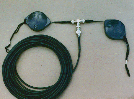 It utilizes two Radio-Shack wind up SWL antennas. I had to add about 10' of wire to each spool for proper matching on 40m. They connect to the coax via BNC connections with nylon strain reliefs. One to the shield and the other to the center conductor. There is a 10K Ohm resistor shunted across the connection to bleed off the static charge I'm likely to pick up on a windy day at 14K feet. Due to the weight of the connections I chose for this design, the antenna isn't as light (ie. trail friendly) as it could be, but I feel that is made up in durability and the ease of assembly and disassembly. A serious consideration for operation where sudden severe WX is a possibility.