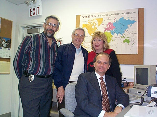 picture 7 = Curt-WB9ZEZ in back, Mr Hollingsworth, Kellie-KB9MOH, and Sandy-W9JOE shaking hands with MR ENFORCER