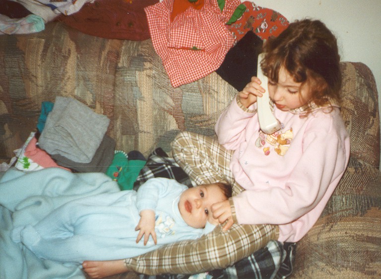 Genny and Johnny hanging out amidst the clean clothes waiting to be put