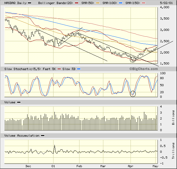 For the month of May, I will be honest with you. I don't know what the market will do. I will not be surprised if we have a correction in the near future where the Nasdaq could dip back down to around 1700. However, I will not be surprised if the market keeps going up for a while longer, possibly as high as 2700. The Feds cut interest rates unexpectedly a couple weeks ago which has had a positive effect on the market, and they may again around May 10. The latest stat showed that the American economy grew 2% the first quarter which is a positive sign that we are exiting the slump. I personally believe we have seen the market bottom, indicated on the chart with the circles. As with any slow period, the big-name companies are the first to show positive gains which we are beginning to see. Therefore, I suggest investing in large corporations and wait to buy the smaller companies until the end of the year unless the smaller company has outstanding fundamentals and is in a promising industry. |