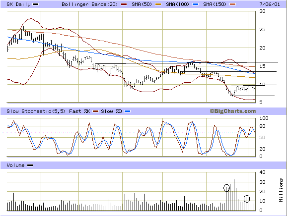 GX- Global Crossing is my favorite stock pick right now given the market conditions. GX has the only intercontinental fiber-optic cable lines, which incidentally are faster than satellite for continent-to-continent communications. GX has mega dollars flowing through them right now, and they recently announced that they will pay about $1.60 per share in dividends on August 1 to all shareholders as of the close of July 16. Given the current price, even if the price doesn't move, the dividend will be around an 18% gain. However, I expect the price to climb pretty soon because GX also recently announced that its multi-year project to develop the cable network is finally complete, so now they will rake in the dough from leasing to other companies. For all you technical traders out there, volume tells a lot about direction of a stock. As a stock declines or inclines, its volume generally grows. Then, the volume is less the next day, sometimes sharply less. From the last day of the volume increase, the stock generally reverses direction within 2 to 4 days (note circles on chart). Therefore, when you notice the volume decreasing, many times you should reverse your position. Of course there are exceptions to every rule, and the trick is determining when those exceptions occur. Perhaps we will see a move in the stock in the next few days. |