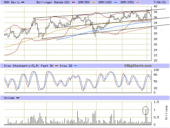 MON- Monsanto is a good solid company that has market share in the agricultural industry. They have superior products in seed and chemicals, both items farmers rely on for a crop. Don't expect to get rich quick with Monsanto, but it is a slow and steady climber and may be very profitable in a year's time. In the short term, support lines exist at about 35 and again at 33, while a major resistance line is at 39. In short, not very volatile, but slow and steady growth that will be around for a while. |