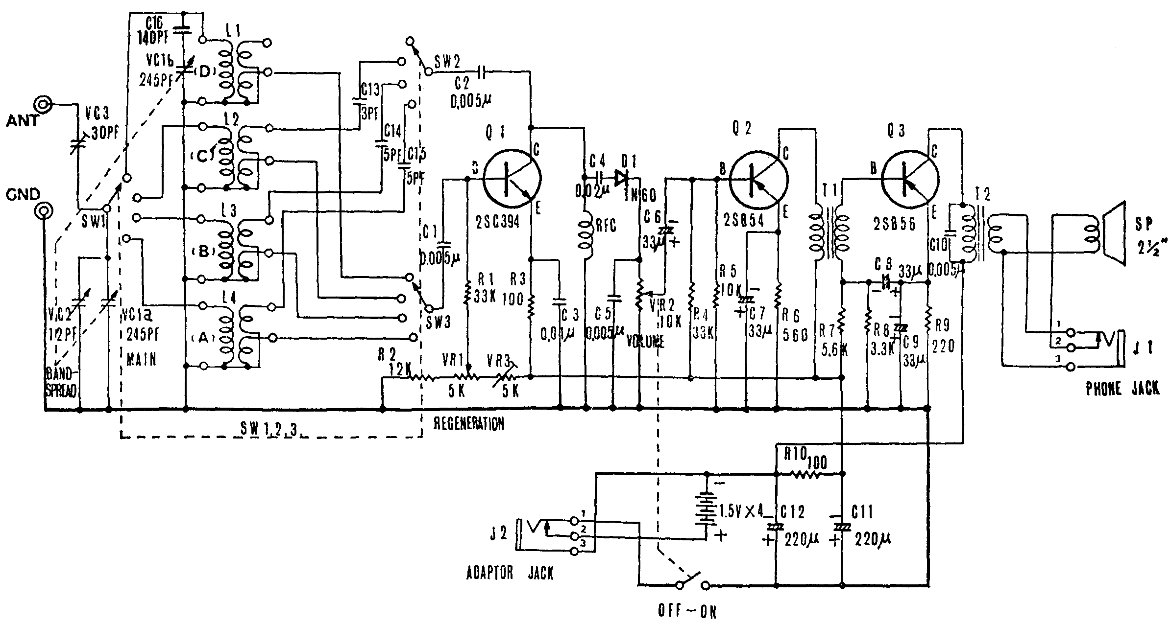 This amazing radio could tune in stations from around the globe and deliver them at full speaker volume with only 3 transistors. It has a regenerative detector, a design that dates back to before the invention of the superheterodyne which is in common use today. It could be a bit fussy to tune, and would be more to the liking of the hobbyist than the casual listener. |