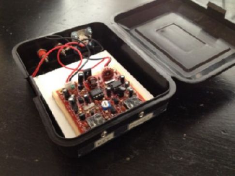 Cased in chinese tea tin box. Puts out about 100 mW on 9 volts."
