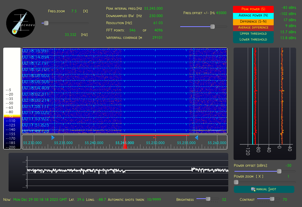 Echoes software, RF signatures of meteors entering the atmosphere may be recorded. Echoes was developed by Giuseppe M. Bertani. The story begins with Canadian television station CHBX in Sault Sainte Marie, Ontario, Canada.