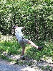 (right) Andy throws a soda bottle into a tree to get a wire over a high branch.