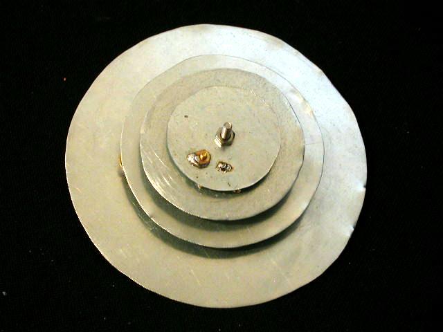 | My assembly method differs slightly from the original in terms of the use of spacers. We also start with the 1269 MHz reflector, the largest disk. The 10-24 bolt starts on the connector side and a 1/2" spacer goes on the bolt as shown. 1/2" of #12 copper wire is soldered to the N-connector [not shown here] before the next level is attached. |