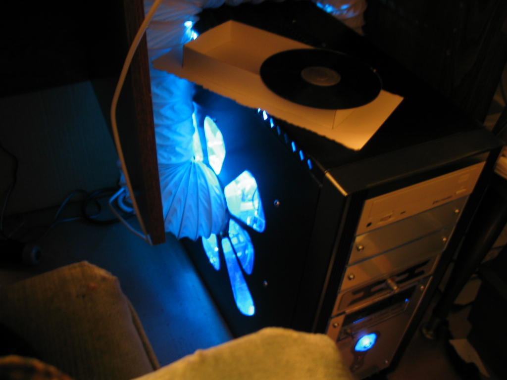 The most recent picture of my computer, taken a few weeks back when I had it apart to add in the hard drive cooler, and now power supply. It is quite messy, which is why I am thinking of using some of the flex tube to put things in order. The new round IDE cables helped a lot though.