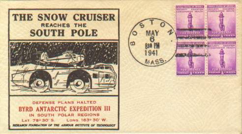 Around 1939, scientists at the Research Foundation of the Armour Institute of Technology began building a large research vehicle (a behemoth) called the Snow Cruiser. It was an ungainly beast with huge balloon tires, (built by Goodyear) built to withstand the harsh environment of Antarctica. It weighed 75,000 pounds, was more than 55 feet long, 20 feet wide and was 16 feet tall. It was designed for a range of 5,000 miles and could support five people with supplies for a year. It carried a reconnaissance aircraft on top of the cruiser (as you will see depicted in the cachet on the one cover) for aerial photography.
