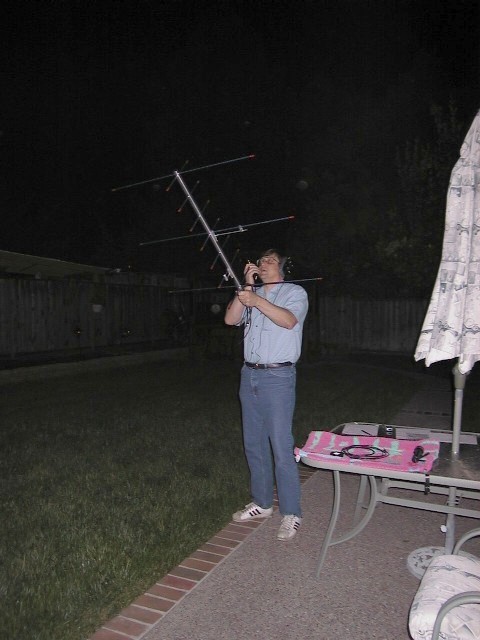That's me with the Arrow antenna in my backyard. I worked AO-51 when it passed overhead a little after 9PM on Friday night, April 1, 2005. I'm amazed at how well I can hear AO-51 with this little gem of an antenna. |