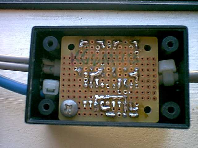 When shopping for parts, I found a small enclosure and a matching perfboard designed to fit inside. The perfboard is the type with pads for all holes, and no solder mask. This allows you easy solder bridges, which I am using to make the circuit (see photos below). Since making solder bridges can keep your iron on one spot over and over, I decided it was worth spending a few cents more, and used sockets for the opto isolators. I didn't want to cook them. The RS-232 connector is the female side. When looking at the connector, pins are numbered from right to left, top to bottom (as shown on the schematic). The DIN is a male connector, and pins are numbered left to right, top to bottom when looking at it (also as shown on schematic). You want to keep the cables as short as practical. You don't want to turn them into antennas. In my initial design, I had a problem where the transmit relay in the rig would chatter on full power RTTY. What was happening, was as soon as the rig was keyed, RF would get in, and unkey the rig. My RF environment is not favorable, so I may be an extreme example (you can read about this on my main page). Shortening the rig to interface cable down, and installing ferrite cores solved this problem.