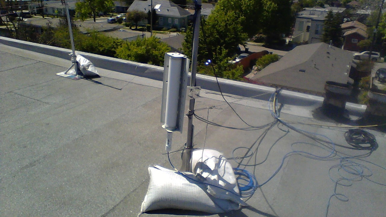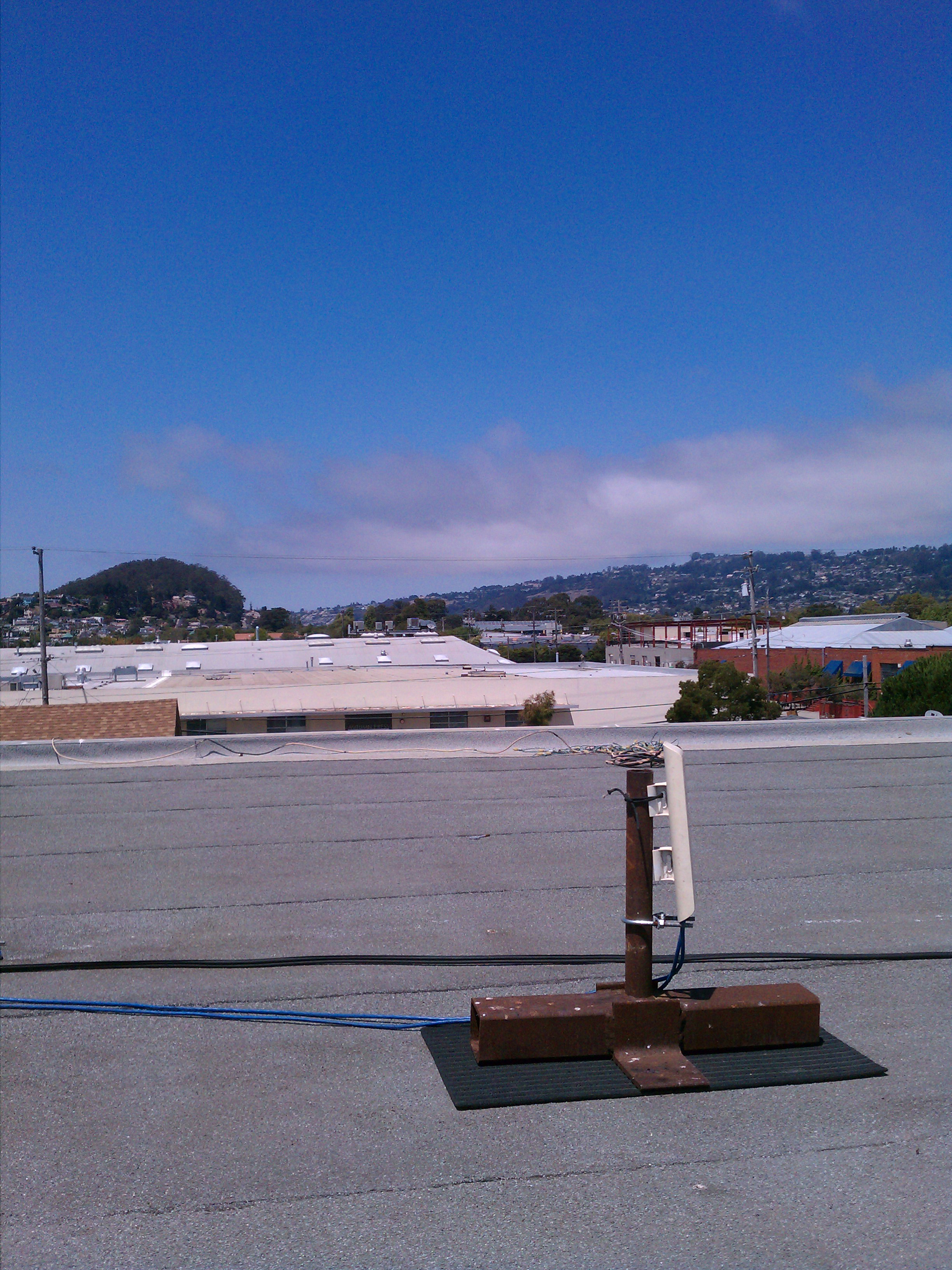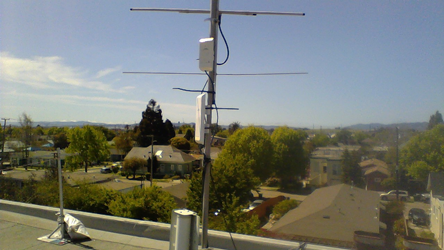 2.3-2.7ghz Bullet hp2 (bottom) NanoStation M2 (middle). If you notice the yagi is pointed at UC Berkeley's Campanile, there is no station currently located at the other of that signal. (view to UCB pictured below)