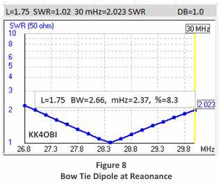 A standard Straight Dipole at 28.4 mHz has a minimum SWR of 1.38:1. At a reference point of 30 mHz the SWR is 3.564. The difference in SWR at the reference point is 2.18. This is a relatively large drop indicating a relatively narrow SWR curve. ![]() In Figure 8 A standard Bow Tie Dipole at 28.4 mHz has a minimum SWR of 1.02:1. At a referenve point of 30 mHz the SWR is 2.023. The difference in SWR at the reference point is 1.0. This is a relatively small drop indicating a relatively wide SWR curve. Apples