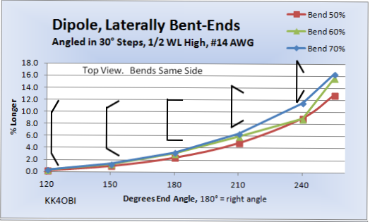 Rule of Thumb for tuning when at a right angle bend (180°): If the impedance is greater than 50 Ohms, increase the angle of bend. If the impedance is less than 50 Ohms, reduce the angle of bend. Effect of Angle of Bend on Wire Length, Opposite Sides ![]() Figure 6 A graphic representation of the angle of bend is shown in black In Figure 6, compare it with the Same Side data in Figure 4 below. Basically the same but observe that the red line (Bend 50%) and blue line (Bend 70%) traded places. Now, when the horizontal straight section of the antenna is shorter, the % Increase in wire length is greater. Just the opposite of Figure 4. ![]() Figure 4 for comparison Interesting Tuning Effect, Opposite Sides In Figure 2 there was a curiosity around the 10% point where the impedance was oddly at 50 Ohms. Optimizing for lowest SWR found that 12% was the best length with the bent arms at right angles. Another way of looking at this effect is that the dipole has been shortened 12%-3% longer = 9% with no perceptable change in gain (7.24 vs. 7.35 dBi) and slightly more radiated power (1.05 vs 1.37 SWR). Also, if we were to bend the arms greater than 180° that would reduce width and shorten the dipole even more because of the overlap. An interesting possibility. What happens at 12% if we vary the angle of the bent arms? ![]() Figure 7 A graphic representation of the angle of bend is shown in black The answer turns out: "Practically nothing, other than the length of wire gets longer at greater angle." Gain is flat. It starts at 1.33 dBi at 120° and ends up at 1.25 dBi at 255°... an undetectable 0.08 dBi change. SWR is almost flat. It starts at 1.33 at 120°, drops to 1.05 at 180° and ends back at 1.25 at 255°. Conclusion: You are free to bend arms with no significant performance change. Skew effect at 12%, Opposite Sides Also, as the bent arms become longer, more of the RF is radiated from them! Skew gradually increases. In this case, only 12% of the wire is radiating broadside to the center. 88% of the wire is radiating RF broadside to the bent arms. In this case the result is that the far field radiation pattern is skewed considerably. Below is a 3D view looking down where the arms are bent to 240°. ![]() Figure