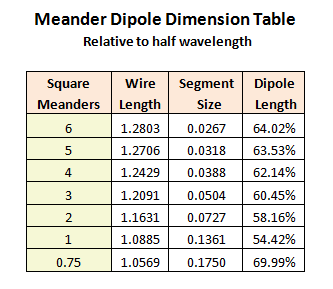 to a 50 Ohm coaxial cable? Only the 0.75 and 6 meander dipoles provide a good match. Dipoles with 1 to 5 meanders have low impedance around 30 ohms and and SWR around 1.7. To solve this problem, the straight forward approach for modeling is to remove the square restraint of horizontal an vertical segments being the same length. ![]() Figure 3 Basics of Meander Antenna Computer Optimization The software has the ability to systematically adjust Segment Width and Height to find a 50 ohm optimum. To take advantage of this capability, various non-squaremodels were tried. Perfect 1:1 SWR matches for 1 to 5 meander dipoles were found using wider segments and heights around 40% of width. Making meanders higher does not work. This causes causes the impedance to fall. Figure 4 gives the resulting normalized dimensions. ![]() Figure 4 Note that Dipole Length values for 1 to 5 meanders are 80-ish % as long as a straight dipole. Dissapointing. It would be difficult to justify the effort to build one of these low SWR antennas for such a small reduction in length. Consider these studies as an example of how wire antenna modeling can save a lot of wasted effort. On the other hand, this is where Off Center Feed (OCF) is a much simpler solution for matching square meander dipoles. In this case, placing the feed point at the mid-point of one of the arms of the dipole will give an excellent match for 50 Ohm coaxial cable. Placement is not critical The antenna remains 60-ish % of a straight dipole. However, choke balun should be at or near the feed point to prevent common mode current on the cable. Suggestions for OCF: For a 5 Meander dipole, feed at around the 9th segment from center. For a 4 Meander dipole, feed at around the 7.5th segment. For a 3 Meander dipole, feed at around the 6th segment. For a 2 Meander dipole, feed at around the 4th segment. For a 1 Meander dipole, feed between the 2nd and 3rd segments. This concludes these basic meander computer modeling studies. Althought there are an enormous number of variants developed since the coming of the cell phone, this information should be adequate to introduce this antenna length reduction technique for amateur radio applications. Dick Reid, KK4OBI at QSL.net |