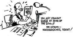 Gil started cartooning for the ARRL back in June 1927. His characters -- such as Jeeves the Butler and the gang at the Podunk Hollow Radio Club -- became old friends to readers of QST. Gil's first Jeeves cartoon was published in February 1940: From the other room comes his master's voice, saying, "Jeeves, come here and help me look for DX!" Jeeves, not really sure what exactly DX is, comes on the run with a road map, a telescope, binoculars, a lantern, a compass and a butterfly net in hand! As a native of the great state of Texas, my favorite Jeeves cartoon shows him trying to push a giant QSL card (from Texas, of course!) through the door -- the card can barely get through. Of course, things are bigger in Texas! If you ever tour ARRL Headquarters, you can see a large version of this cartoon in the second floor hallway. The mythical Podunk Hollow Radio Club depicted the idiosyncrasies of a group of radio enthusiasts getting together. The cover for the June 1964 issue of QST shows the Podunkers -- hundreds of them -- happily camped out in a forest setting. In the large tent in the rear, several hams are operating their radios. In the foreground, several more are chatting up a couple of attractive girls in a convertible, little cartoon hearts fluttering over one ham's head. And off to the far right, the Department of Conservation is beginning to set up their blasting apparatus with its accompanying signs of "Turn off all two-way radios!"