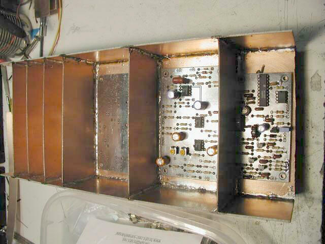 After redrilling the holes for the Log Amp board, I repaired the now extra holes using small strips of solder wick. As you might guess, I used a fair amount of solder wick on this project, and I always save the wicked up pieces. They are perfect for fixing small holes in PCB material (such as needed here just to make sure the sections were RF-tight), for making ground straps, etc.