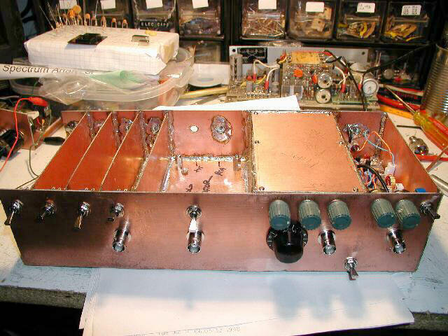 The Timing Base doesn't really have to be shielded, as all signals are DC. But since I wanted a fully self-contained unit, I put a top on it as well. The Log Amp is also installed, as is the 10MHz Resolution Filter. At this point, I could test the Timing Base, Log Amp and 10MHz Filter, using my MFJ Antenna Analyzer as a 10MHz signal generator. Adequate for this part of the job, for sure. Tuned the filter for the largest sine wave amplitude in my oscilloscope at 10MHz.