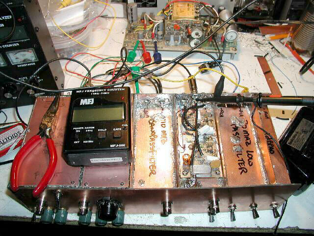 I also forgot the VCO sample output which is used by the Tracking Generator. I decided to just run it through an RCA jack in the floor. If you look closely in the front left (lower left in the photo), just in front of the board, you'll see this jack, covered by a protective shielding. Wes, W7ZOI, made careful note that this connector should be well shieled. I took a 1/2" diameter by 1/2" piece of brass tubing, soldered to the floor around the jack, then solded RG-58 shield to it and to the shield of the RG-174 going over to the LO board. It took two tries to get this right. The first time, I melted the center conductor of the RG-174 and shorted it out. The second time, I was more careful and used less heat.