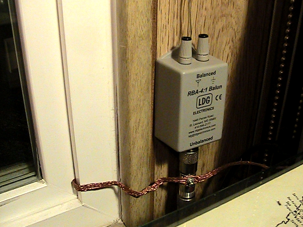 The feed line & balun are installed. The copper braid exits the window to the ground rod. | After the blinds are closed, the feed line and balun are out of view. |
