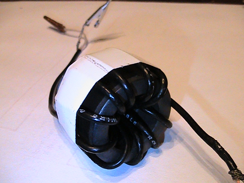 Described in detail separately in Zip Cord Transmission Lines and Baluns9 In December 2010, the 24 AWG transmission line was replaced with lower loss 18 AWG speaker wire (Figure 48), common mode chokes were added (Figure 49) and the 4:1 voltage balun was replaced with a 1:1 current balun (Figure 50) in order to reduce the antenna feed system noise and attenuation.
