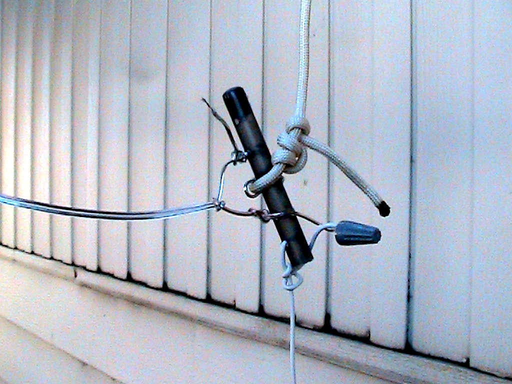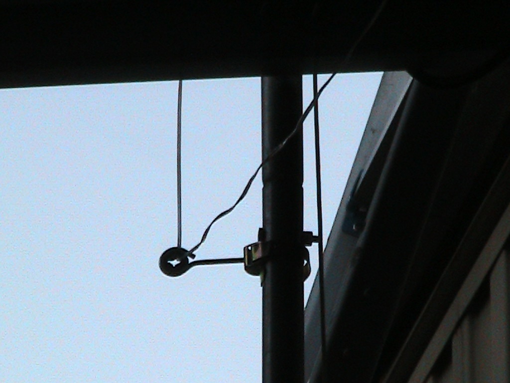 | This tie string tension pulley is mounted atop the mast that supports the feed point with a machine screw eye bolt. | Here is the assembled feed point raised 20 feet to the top of the supporting mast. | Here is the southeast corner of the loop antenna. The screwdriver antenna base is visible on the roof of the house. | At the corner supports, the loop wire passes through a