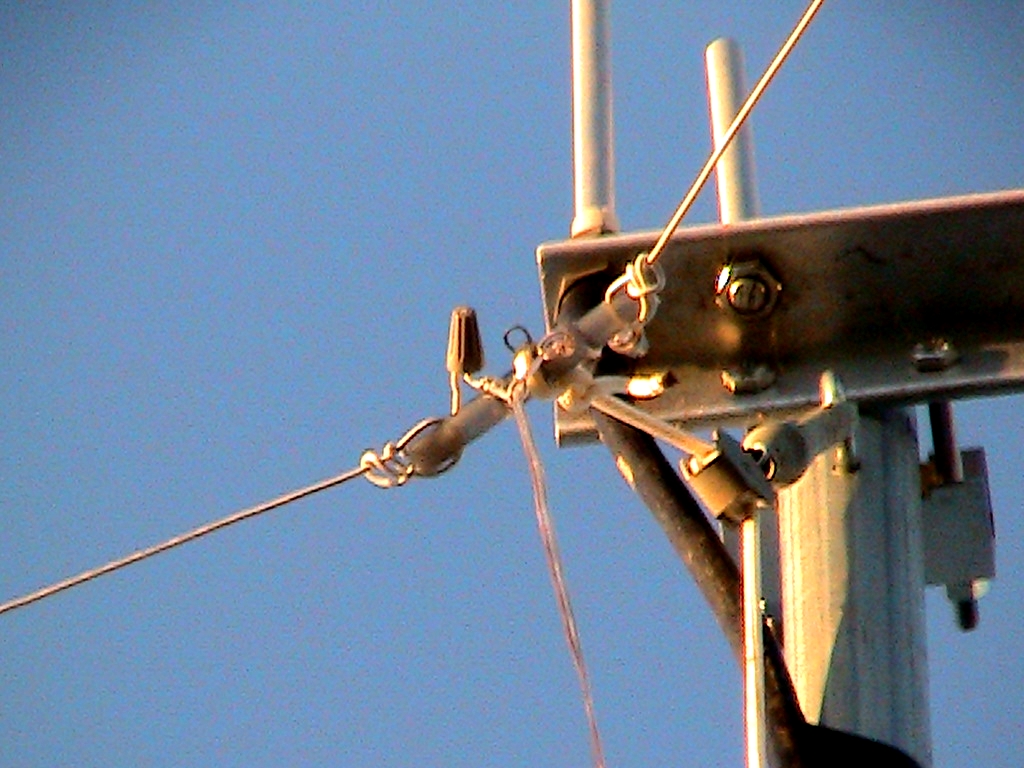 The feed line is suspended away from the mast with twin lead standoff insulators. |