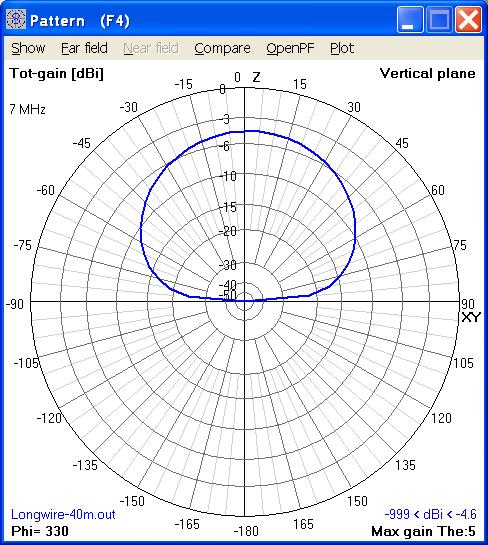 Figures 5 through 16 are the calculated far field radiation patterns comparing the vertical antenna and the random wire antenna on 7 and 14 MHz (North is at the top of all azimuth and 3-D patterns).