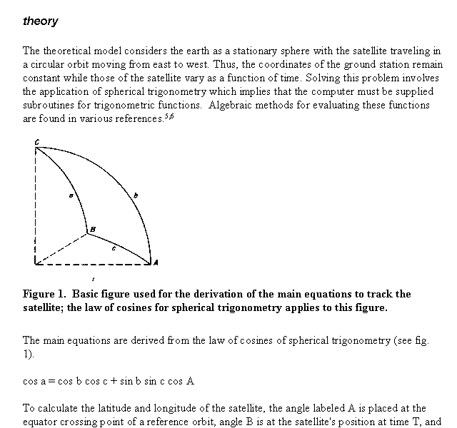 Milazzo, Carol F., KP4MD, "Programming for Automated Satellite Communication", ham radio, Vol 11:6, June 1978, pp. 68-71. Algorithm for a satellite locating program for the Texas Instruments SR-52 programmable calculator.