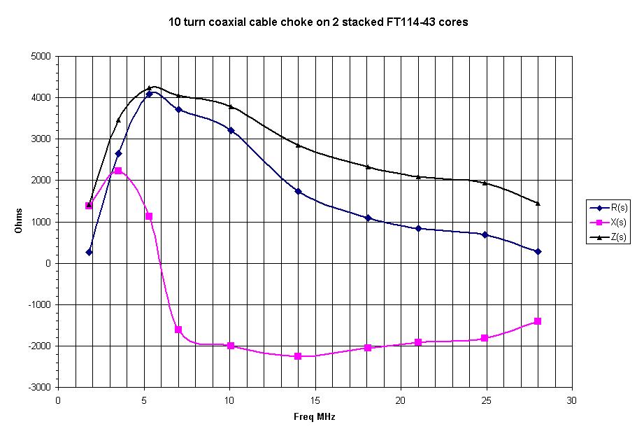 The MFJ-202B noise bridge has a greater range than the antenna analyzer and was used for further impedance measurements. The noise bridge was calibrated5 to increase the accuracy of measurements. Table 2 lists the common mode impedance of each toroid choke over the frequency range 1.8 through 28 MHz. Above 1.8 MHz all measured impedances exceeded 1000 ohms.