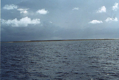 Daybreak in King Lagoon as we search for the reef. It appears just as a speck on the horizon just to the left of the vessel. WB4JTT stands lookout.
