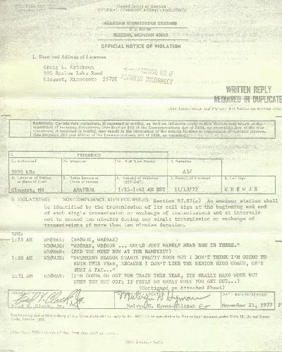 This is an official notice I received from the FCC on 11/13/77. I was in QSO with WB0RAS and was cited for going 17 minutes without identifying. Pretty unbelievable huh? Click on image to zoom in.