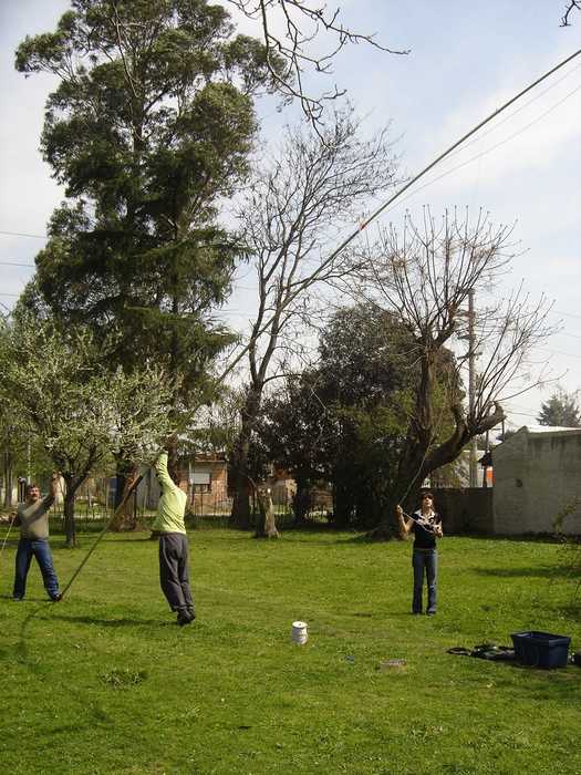 Asumimos que la configuración debería también funcionar con bandas más altas, pero la realización de antenas verticales para la frecuencia de 14 Mhz. o mayores no ofrece dificultad dado lo reducido del irradiante, por lo que decidimos volver a probar la carga lineal de otras formas; esta vez haciendo dos lazos cruzados, para reducir aún más la altura total de la antena. Utilizando partes del irradiante, los travesaños aislantes disponibles y una rama seca a falta de un cuarto travesaño, conformamos la carga lineal doble, comprobando que las mediciones de ROE continuaban coincidiendo con la longitud de cable e irradiante empleado. No pudimos realizar comunicados ni comprobar la recepción ya que la frecuencia donde teníamos la lectura de menor ROE quedó fuera de las bandas de aficionado, no obstante, la prueba sirvió para alentarnos a un próximo proyecto de una vertical para la banda de 160 metros. |