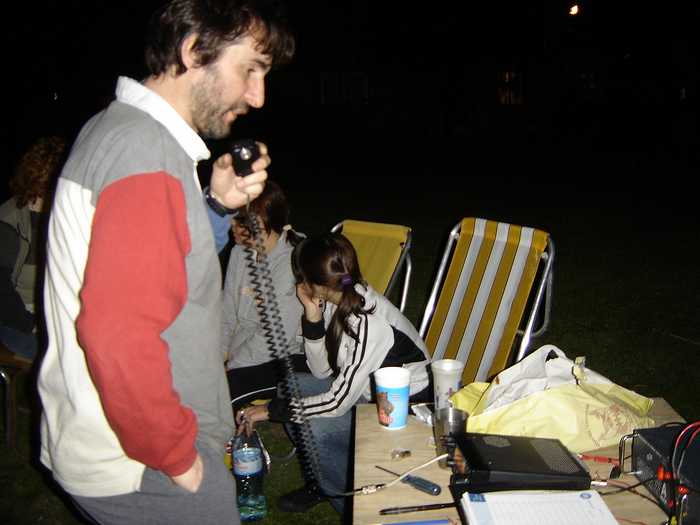 Terminado el montaje, mis impresiones fueron que una antena de semejante altura no sería fácil de mantener erguida y tampoco podría ser instalada sin la ayuda de dos o tres personas más, por lo que, aunque logramos hacerlo, me sentí algo decepcionado de lo problemático de este punto. Pese a lo dicho, la antena estaba instalada, y nos dispusimos a realizar las primeras pruebas transmitiendo. No disponía de dip-meter ni otro instrumento más que el roímetro, por lo que nos guiamos por las lecturas del mismo, buscando las frecuencias de mínima ROE. Allí comenzaron algunas sorpresas... La antena presentaba una ROE de 1:1,2 en la frecuencia de 2300 Khz. lo que indicaba que había superado ampliamente el largo necesario para ajustar en la banda de 80 metros. Probamos cortocircuitando el lazo de la caga lineal, a la altura del tramo aislante inferior, observando que la frecuencia de medición de mínima ROE estaba muy por debajo de la banda de 40 metros, obviamente a causa del largo del irradiante, pero confirmaba la teoría de que podía anular la carga lineal con sólo cortocircuitarla adecuadamente. Otra prueba que realizamos fué modificar la disposición y cantidad de radiales, que notamos influían notablemente en las mediciones de ROE, al igual que la utilización o no de la toma de tierra, conectada solidariamente a la malla de masa y radiales, aunque de cualquier manera seguíamos lejos de obtener bajas de ROE en las frecuencias deseadas. |